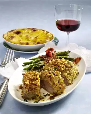 Dab meat dry. Fry on all sides in hot oil. Season with salt and pepper and place in a greased ovenproof dish. Press the olive mixture onto it. Approx. 15 minutes before the end of the baking time, add to the gratin and bake. Arrange everything. Served with: bean-bacon parcels and roasted cherry tomatoes