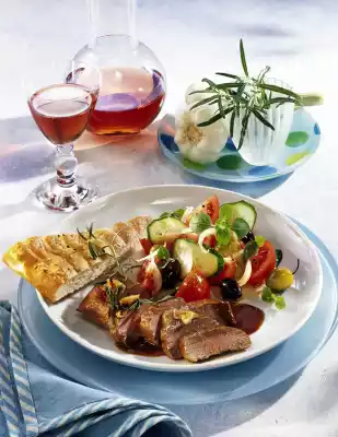 Clean, wash and drain the tomatoes and cucumber. Cut tomatoes into slices, cucumber into thin slices. Peel and halve the onion and cut into fine strips. Wash oregano, dab dry and chop except for something to garnish.