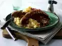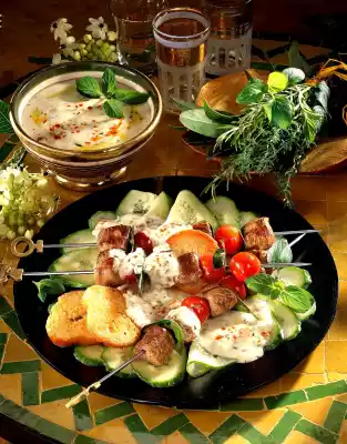 Chop onion finely, press garlic through a garlic press. Wash mint, thyme and rosemary, dab dry and chop finely, except for some mint for garnishing. Heat 3 tablespoons of oil in a saucepan, sauté the onions and half of the garlic until transparent. Add herbs and fry briefly. Mix cornflour and 5 tablespoons of water and add to the yoghurt in the pot. Bring to the boil very gently, stirring constantly (only briefly so that the starch taste disappears). Season with salt and pepper and keep the sauce warm. Cut the baguette into thin slices. Heat the fat in a large pan and fry the baguette slices in it until golden brown. Add the rest of the garlic at the end and fry as well. Wipe out the pan, heat the remaining oil in it and fry the skewers for 6-8 minutes while turning. Season with salt and pepper.