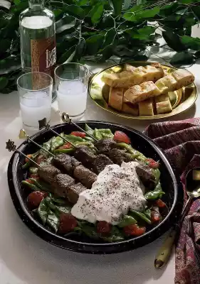 Put meat on skewers, place on the grill and grill under the preheated grill for 15 minutes. Turn from time to time. Mix the remaining onions and yoghurt. Season to taste with salt and pepper.