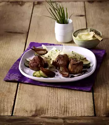 Peel and halve the shallots. Heat 1 tsp. oil in a saucepan. Brown the shallots briefly and deglaze with vinegar, apple juice and honey, simmer for about 8 minutes. Season to taste with salt and pepper