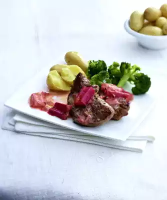 Wash the meat, dab dry and season with salt and pepper. Heat oil in a large pan. Fry the meat for about 8 minutes while turning. Heat 1 tablespoon of fat in a second pan and toss the broccoli for about 3 minutes. Season with salt and nutmeg. Arrange broccoli, potatoes, meat and rhubarb