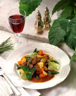 Cover and cook for about 30 minutes. In the meantime peel and wash the carrots and potatoes and cut them into small pieces. Clean and wash the beans and white cabbage and cut them into bite-sized pieces. Cook the prepared vegetables for about 8 minutes in boiling salted water. Then drain and add to the lamb stew 5 minutes before the end of the cooking time. Season to taste again and serve garnished with fresh rosemary and mint as desired