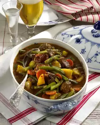 Heat the oil in a frying pan. Sauté the meat in it in portions. Season with salt and pepper. Fry the onions and soup vegetables briefly in the frying fat, add the tomato paste and sweat briefly. Add meat again, deglaze with approx. 1 litre of water and braise for approx. 1 hour.