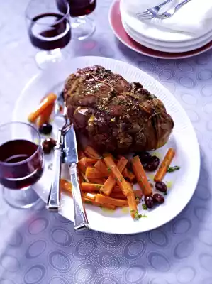 Cut lemon slices into small cubes. Peel and halve the onion and cut into thin slices. Peel garlic and chop coarsely. Wash leg of lamb, dab dry, bind into shape and season with salt and pepper. Heat the oil in a frying pan. Brown the meat in it all around, then add onions, garlic and lemon cubes and fry for another 2-3 minutes. Deglaze with stock and cognac and bring to the boil again. Cover and braise in a preheated oven (electric cooker: 200 °C/ convection oven: 175 °C/ gas: see manufacturer) for about 2 1/2 hours. Add the olives about 20 minutes before the end of the cooking time