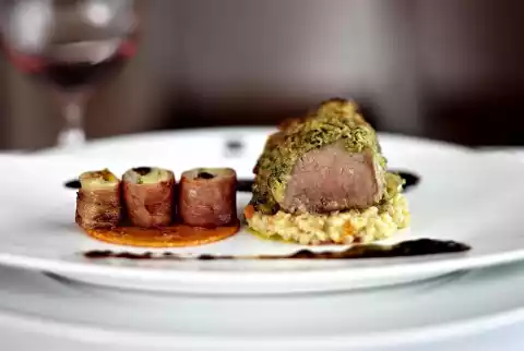 Spread the lamb filet with herb paste. Bake under the grill of the oven until light brown. Heat up the gravy. Slice the lamb and cut the Saltimbocca tips into small rolls. Serve with the jus.