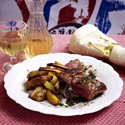 Take the meat out of the oven and cut into 8 pieces (2 ribs each). Potato wedges, arrange 2 pieces of meat and mint sauce on plates