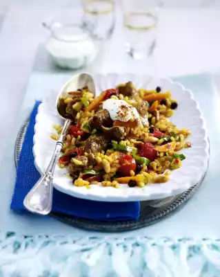 Wash and drain the raisins. Clean or peel and wash leek and carrots. Cut leek into rings and carrots into slices. Chop the almonds coarsely. Add rice, leek, carrots, almonds and raisins to the meat and continue to braise covered for about 20 minutes.