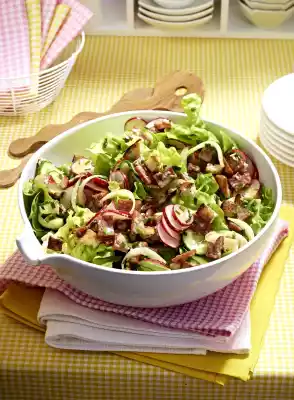 Clean, wash and slice the radishes. Wash, clean and slice the cucumber. Peel onion and cut into thin slices. Marinate radish, onion and cucumber with prepared dressing. Dice the buns. Heat 2 tablespoons of oil in a frying pan and fry the bread cubes for about 3 minutes, turning them over. Cut sausage into thin slices