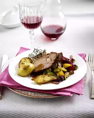Remove the fat pan from the oven. Put the leg on a plate. Keep warm when the oven is switched off. Remove the frying set from the fat pan with approx. 300 ml water. Put the braising stock and the vegetables in a pot and puree very finely. Fill up sauce with water to approx. 1 litre, bring to the boil, thicken with sauce thickener, season with salt, pepper and sugar. Arrange leg, some sauce and vegetables on a plate. Add potatoes