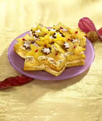 Sprinkle 200 g sugar on top. Spread the beaten egg whites evenly on the dough. Bake in the preheated oven (electric cooker: 175 °C/ convection oven: 150 °C/ gas: level 2) for 20 minutes. Remove the base from the oven and let it cool down on a cake rack. In the meantime, soak the gelatine in cold water. Whip the mascarpone and 1 packet of vanilla sugar. Stir in yoghurt and 2 teaspoons of cinnamon. Squeeze the gelatine, dissolve in a pot, mix with 2 tablespoons of mascarpone mixture and fold into the remaining mixture. Spread the mixture evenly on the cake base without meringue. Place the cake base with meringue on top and refrigerate for at least 2 hours. Wash, dry and slice the starfruit. Decorate the cake with cinnamon stars, starfruit and pomegranate seeds and dust with 1 teaspoon of cinnamon
