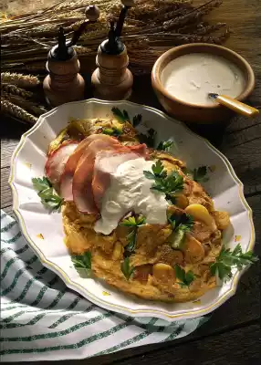 Brown the onions briefly in it. Add the potatoes and fry for about 5 minutes, turning them until golden brown. Salt to taste. Fold in cucumber slices. Pour egg milk over them and let them simmer at medium heat for about 5 minutes. Fold the omelette onto a plate. Add the smoked pork loin and garlic quark. Wash the parsley, pluck off the leaves and sprinkle over the omelette