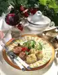 Cut the potatoes crosswise and break open a little. Spread the salad on top. Mix yoghurt and crème fraîche. Spread the salad on top as well. Serve garnished with lettuce leaf, lemon slice and dill.