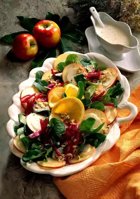 Mix the ingredients and arrange on a plate. Squeeze oranges for the sauce. Mix buttermilk and orange juice. Season with salt, pepper and sugar. Pour over the salad. Serve garnished with orange wheels