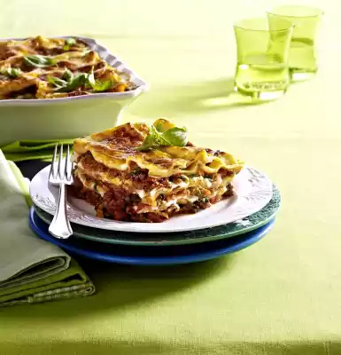 In a casserole dish, alternately layer the minced meat, 3 lasagne dishes and cheese sauce, finish with the cheese sauce and sprinkle with cheese. Bake in a preheated oven (electric cooker: 200 °C/ convection oven: 175 °C/ gas: see manufacturer) for approx. 30 minutes until golden brown. Remove, sprinkle with the remaining basil and serve immediately