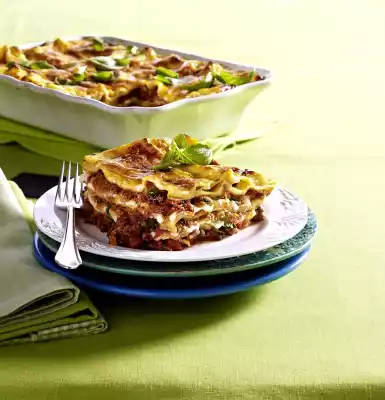 4 Vom Herd nehmen und das Basilikum in die Hackfleisch-Tomaten-Mischung einrühren. In eine große ofenfeste Form gießen Sie ein Drittel des Hackfleischs und legen Sie ein Drittel der Lasagneblätter darüber, dann bedecken Sie die Blätter mit einem Drittel der Cheddar-Sauce. Wiederholen Sie die Schichten zweimal mit der gleichen Menge des restlichen Hackfleischs, der Lasagneblätter und der Cheddar-Sauce. Mit dem restlichen Cheddar bedecken und mit Pfeffer würzen.