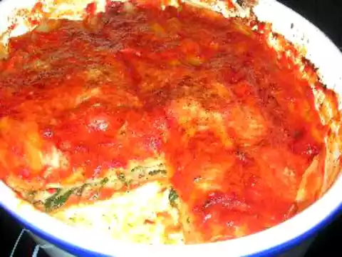 In a casserole dish, first fill about half of the pepper sauce, then place lasagne sheets on top and spread half of the meat spinach filling on top. Place another layer of lasagne sheets on top and spread the rest of the meat and spinach stuffing on top.
