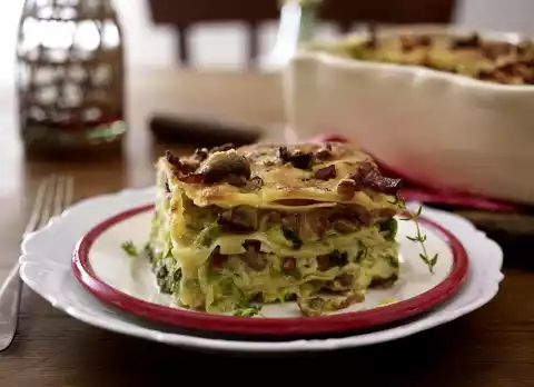 Grease a rectangular casserole dish. Preheat oven (electric cooker: 175 °C/circulating air: 150 °C/gas: level 2). Spread some egg cream thinly on the bottom of the mould. Alternately layer lasagne plates, leek mixture and egg cream.