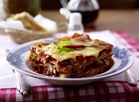 Bake in the preheated oven (electric cooker: 175 °C/ convection oven: 150 °C/ gas: level 2) for approx. 45 minutes. Remove from the oven and garnish with chilli pepper and basil.