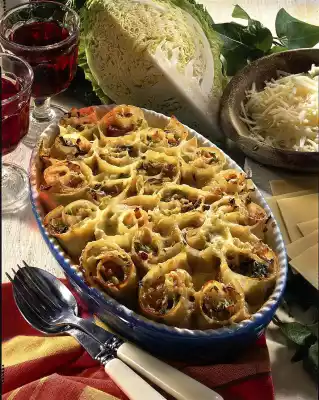 In the meantime, cook the lasagne sheets in portions in boiling salted water for about 3 minutes. Quench, place on a lightly oiled tray and cut in half lengthwise. Spread the savoy cabbage filling on the pasta strips, roll them up and place them close together in a greased casserole dish. Mix stock and 75 g crème fraîche and pour over the lasagne snails