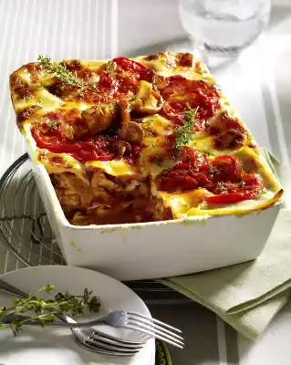 Cut the mozzarella into slices. Grease an ovenproof dish (19 x 27 cm, 6.5 cm deep). Pour in some béchamel sauce. Place 3 lasagne plates next to each other on top. Add the béchamel sauce, chanterelles, tomato sauce and again lasagne sheets until all ingredients are used up.
