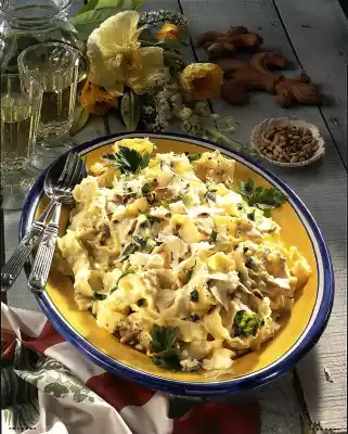 Add cheese and let simmer for about 3 minutes while stirring. Season sauce with salt and pepper. Bring to the boil, stir in sauce thickener, bring to the boil again and keep warm. Drain the pasta and chill in cold water. Add to the sauce, mix and arrange on a plate. Serve sprinkled with pine nuts and parsley. Serve garnished with parsley leaves, parmesan shavings and gorgonzola cubes