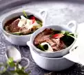 Spätzle in (if possible preheated) soup plates distribute. Fill up with hot beef stock.