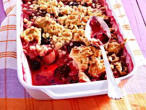 Spread the crumbled dough over the fruit. Bake in a hot oven for about 25 minutes. Remove and serve warm. Whipped cream tastes good with it.