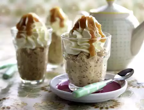 Whip 100 g cream until stiff, fold into the lukewarm rice and divide into four glasses. Place in a cool place for at least 30 minutes until serving.