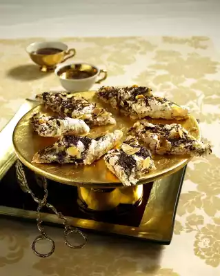 Bake in the preheated oven (electric cooker: 175 °C/ convection oven: 150 °C/ gas: level 2) for about 25 minutes. Remove the baking tray from the oven and immediately sprinkle with remaining chocolate shavings. Leave to cool and cut into lozenges while still warm. Allow to cool completely, then remove from baking tray. Dust with icing sugar as desired