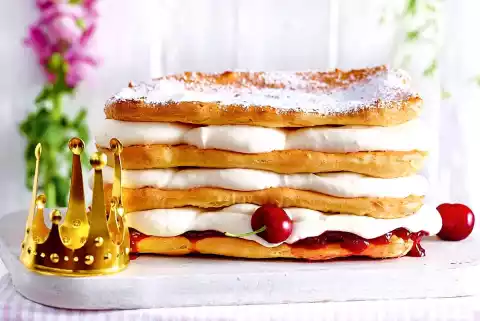 Spread 2 cake bases with jam first, then with cream to a height of about 1 cm. Carefully layer 3 more cakes and the remaining cream on each cake layer, finishing with one cake base. Chill for about 1 hour. Decorate with icing sugar and 1 cherry each. Cut the cake with an electric knife.
