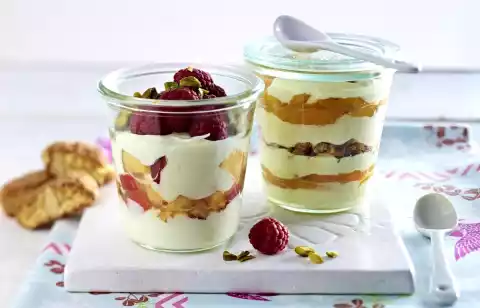 Roast the pistachios in a pan without fat. Take them out, let them cool down a bit and chop them roughly. Sort the raspberries. Mix yoghurt and honey. Layer yoghurt, peaches and raspberries in sealable glasses. Finally sprinkle with pistachios. Refrigerate the layered dish until ready to eat