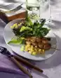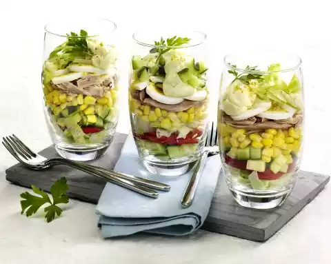 Quarter lettuce, cut into strips and rinse in a sieve under cold water, drain. Drain the tuna. Mix salad cream, yoghurt and milk and season with curry, some lemon juice and salt. Pile vegetables, tuna and salad in glasses and finish with the sauce. Garnish salad with parsley and sprinkle with some curry powder