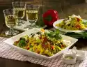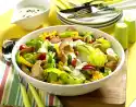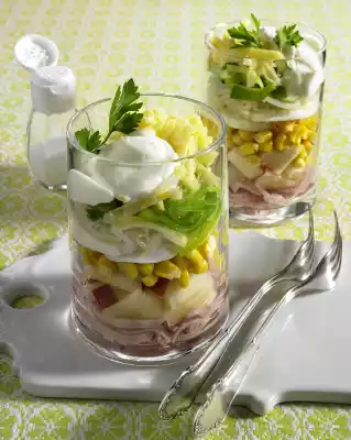 Boil eggs in boiling water for about 10 minutes until hard, drain and quench. In the meantime peel and quarter apples and cut out the core. Dice quarters and sprinkle with lemon juice. Cut ham into strips. Clean the leek, cut lengthwise, wash and drain. Cut into fine slices. Drain celery, pineapple and corn.