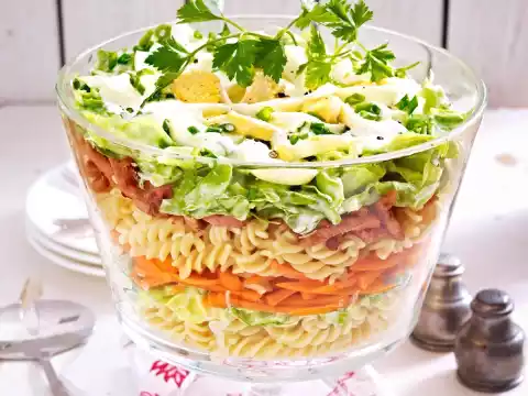 Wash the chives, shake dry and chop finely and add to the dressing. Place one layer of noodles, some lettuce, carrot strips, remaining noodles, meat and remaining lettuce in a glass bowl, drizzle the dressing over each layer. Cut the eggs into fine slices. Garnish layered salad with slices of eggs and parsley