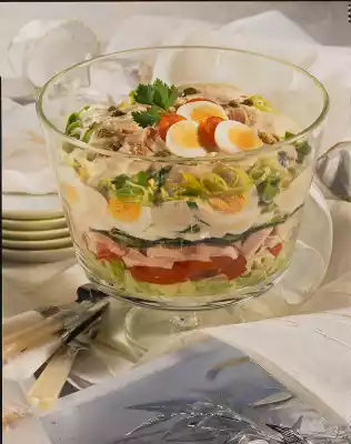 Place the salad ingredients, except for a few egg and tomato slices, alternately in a bowl. Cover completely with the sauce. Cover and leave to stand for at least 2 hours. Garnish with egg and tomato