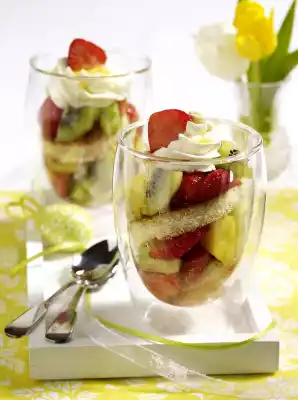 Put the biscuits on a plate and sprinkle with orange liqueur. Whip the cream and vanilla sugar with the whisk of the hand mixer until stiff and place in a piping bag with a large star-shaped spout. Put the sponge cake and fruit salad, except for some strawberries for decoration, into 4 glasses. Spray a cream tuff on each fruit salad and decorate with a piece of strawberry. Pour some marinade over it. Keep cool until serving