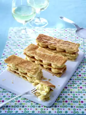 Stir the custard until smooth and fill into a piping bag with a medium-sized piping nozzle. Spread the cream in tuffs over 20 rectangles. Place 2 pastry plates with cream on top of each other and finish with a 3 plate (without pudding).