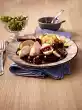 Clean and clean the mushrooms and slice or cut them crosswise. Sort the salad and wash if necessary. Stir 4-5 tablespoons of oil into the potato mixture, season again with salt, pepper, sugar and possibly vinegar. Halve the ham slices or break them into large pieces. Carefully mix salad, mushrooms, ham and vinaigrette in a bowl and serve