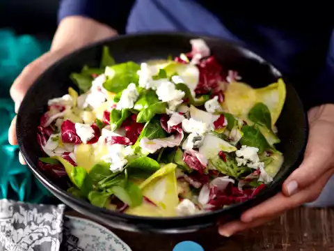 Halve chicory and radicchio lengthwise, remove stalk. Wash lettuce leaves and lamb's lettuce, spin dry. Pluck larger lettuce leaves finely. For the vinaigrette, mix 4 tablespoons of vinegar with some salt, pepper and 1⁄2 tsp. sugar.
