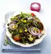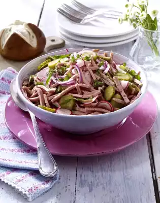 Peel and halve the onion. Cut onion and meat loaf into thin strips. Clean and wash the radishes. Cut radishes and gherkins into thin slices.