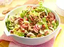 In a second pan, heat 1 tablespoon of oil and fry the eggs. Remove the finished Leberkäse from the pan, keep warm and fry the onions in the frying fat until crispy. Arrange Leberkäse, salad and eggs on plates.
