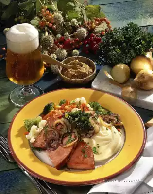 Add the remaining oil to the frying fat. Fry the onion rings for about 2 minutes over high heat while turning. Arrange vegetables, mashed potatoes and meat loaf on plates. Add the onion rings. Serve sprinkled with parsley and garnished.