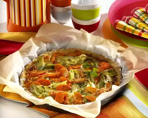 Cover the dough and let it rise in a warm place for about 30 minutes. In the meantime clean and wash the carrots and leeks. Cut carrots into slices, leek into rings. Put the vegetables in boiling salted water and cook for about 10 minutes.