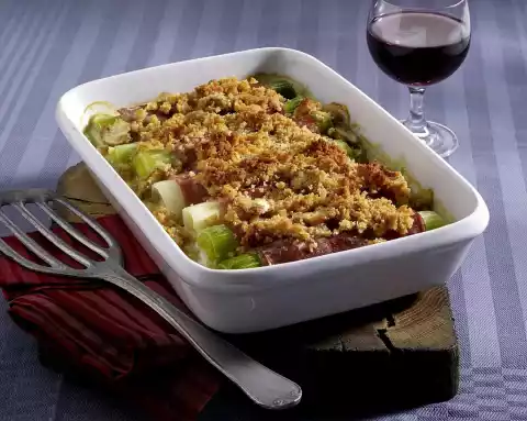 Wrap 1 slice of ham around each leek. Melt butter in a pan, stir in breadcrumbs and season with salt and pepper. Place the leek sticks in the sauce and cover with the crumbs.
