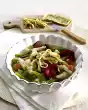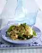 Coarsely chop the walnuts. Drain the pasta. Mix noodles and sauce and serve. Sprinkle the walnuts over the pasta.