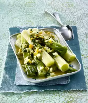 Remove leek from the pot with a skimmer, drain well and arrange on a plate. Spread egg vinaigrette over it.