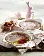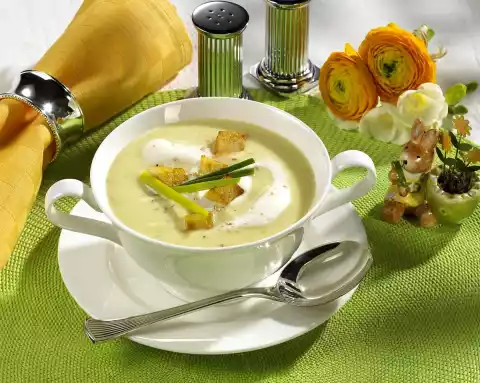 Finely puree the soup and season to taste. Whip the cream until semi-stiff and stir in all but 2 tablespoons. Serve the soup. Garnish with the rest of the cream, potato croutons and leek