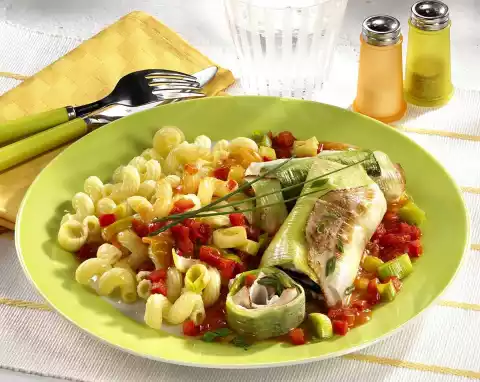 Pour the pasta into a sieve, quench and drain. Wash the chives, dab dry and cut into small rolls. Serve leek and ham rolls, noodles and sauce sprinkled with chives and garnished on plates.