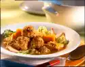 Heat the fat in a pan and fry the almonds until golden brown. Add raisins, garlic, curry, cinnamon and cumin, sauté briefly and deglaze with stock. Add tomatoes, bring to the boil and sprinkle with sauce thickener while stirring. Bring to the boil again briefly and season to taste with salt and curry. Drain potatoes and leek and stir into the curry sauce. Arrange on a plate and serve garnished with parsley